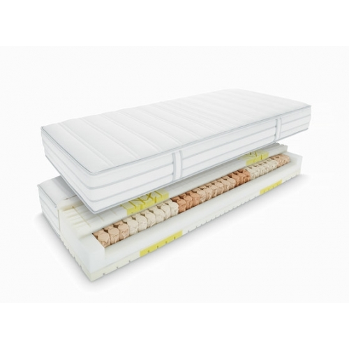 Der luftdurchlässige 7-Zonen-Innenkern aus einzeln stützenden Taschenfedern hat körpergerechte Komfortzonen für Schulter und Gesäss sowie zusätzliche Lendenwirbelstütze. Beidseitige Auflage mit einer 4cm hohen, quer- und längsprofilierten Viscoplatte und einer extrasoften OmniPUR-Einlage im Schulterbereich. Zwischenpolster aus Dryfeel über die ganze Liegefläche sorgt für zusätzliche Durchlüftung.