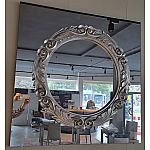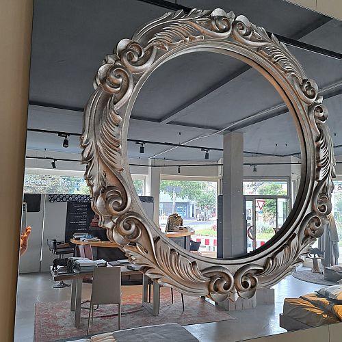 Quadratischer Designer-Spiegel. Rahmen mit schönen Barockdetails, mehrere D-ringe auf der Hinterseite - es kann in verschiedenen Positionen aufgehängt werden, so dass es wie ein „Quadrat“ (90 Grad Winkel) oder wie eine „Raute“ (45 Grad Winkel) aussieht. Es bleibt immer zentriert und in Balance.