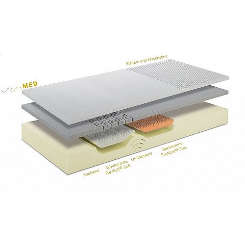 Die SANAPUR MED Matratzen bieten eine wohltuende Druckentlastung und sorgen für eine angenehme Stützfunktion. Die samtige MED-Liegefläche ist atmungsaktiv und reagiert auf Körperwärme und Körperdruck. Sie schmiegt sich perfekt dem Körper an und sorgt für ein entspannt wohliges Liegegefühl. Die Matratzenkonstruktion unterhalb der MED-Liegefläche unterstützt den Körper und sorgt für eine natürliche Ergonomie. Stark beanspruchte und empfindliche Körperpartien wie Schulter und Becken werden dank der innovativen und „geschützten“ SANAPUR HyperSoft-Schulterzone und der Hyper-Flex-Beckenzone bequem und optimal gelagert. Die Muskulatur kann entspannen, die Durchblutung wird gefördert, Wirbelsäule und Gelenke werden schonend gestützt und in ihrer natürlichen Position gelagert